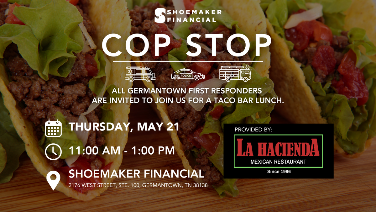 All Germantown, TN, first responders are invited to join us for a Cop Stop on Thursday, May 21st! Enjoy a taco bar and great fellowship at our office between the hours of 11:00 AM and 1:00 PM.